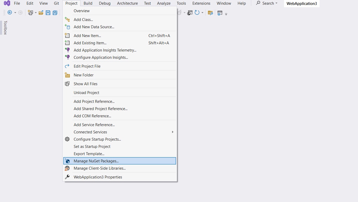 ابتدا باید ابزارهای مورد نیاز برای Scaffolding را نصب کنید. برای این کار از منوی Project گزینه Manage NuGet packages را انتخاب کنید. و ابزار و پکیج های مورد نیاز را نصب کنید.